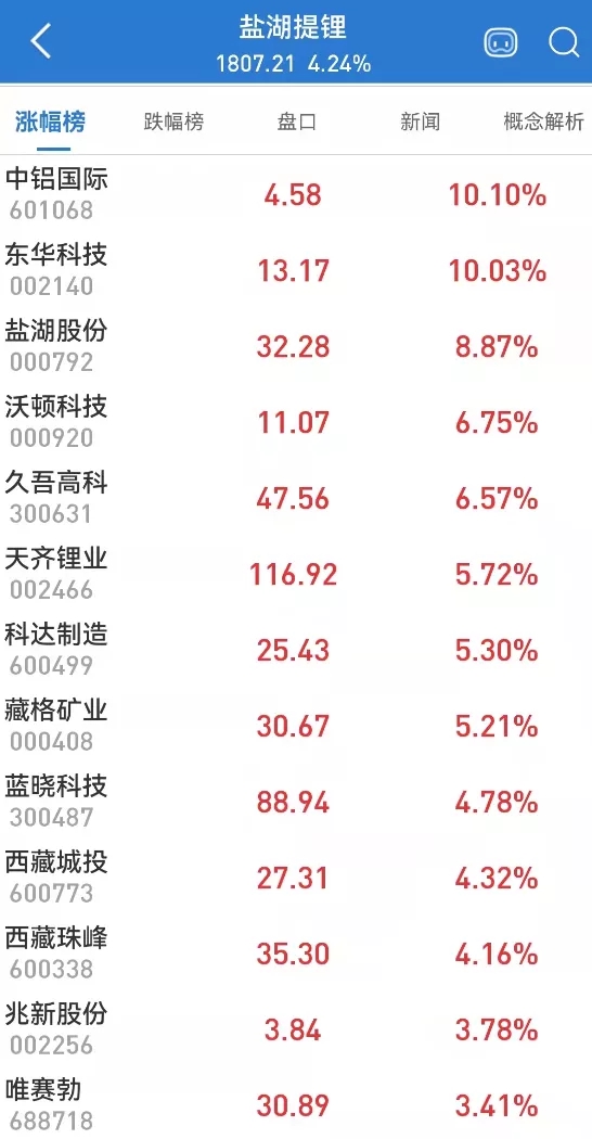 A股盐湖提锂板块盘中整体飙升近5%领涨两市,中铝国际、东华科技、盐湖股份等强势涨停。