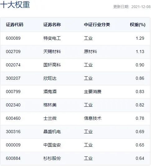 公开资料显示,中证小盘500指数在样本空间中剔除沪深300指数样本以及过去一年日均总市值排名前300的证券,然后对样本空间内剩余证券按照过去一年日均成交金额由高到低排名,剔除排名后20%的证券后,将剩余证券按照过去一年日均总市值由高到低进行排名,选取排名前500的证券作为指数样本,前三大权重股分别为特变电工、天赐材料和国轩高科。