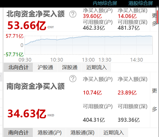 截至沪深股市收盘,北向资金净流入53.66亿元,其中,沪股通净流入39.6亿元,深股通净流入14.06亿元。
