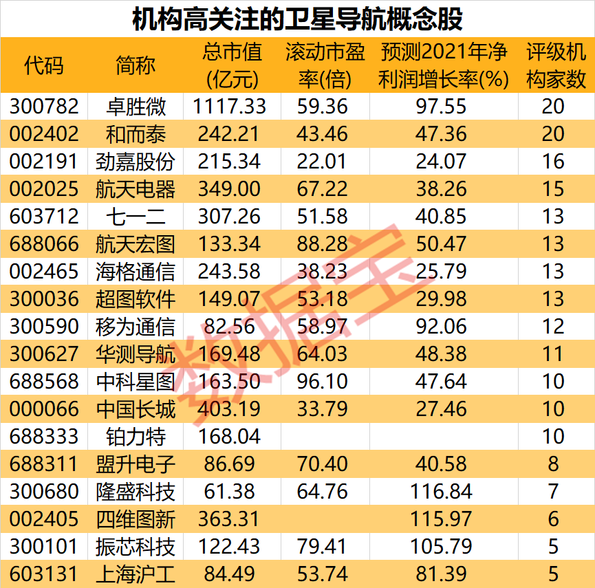 证券时报·数据宝统计,近期获5家及以上机构评级的卫星导航概念股共计18只。卓胜微、和而泰最为瞩目,评级机构均有20家。卓胜微GPS相关产品有GPS LNA和GPS滤波器等,可应用于各种卫星导航系统;和而泰子公司铖昌科技承担国家大型装备型号任务射频芯片的供应,其产品主要应用于北斗二代导航、卫星通信等重大项目领域。此外,劲嘉股份、航天电器评级获15家及以上机构参与。