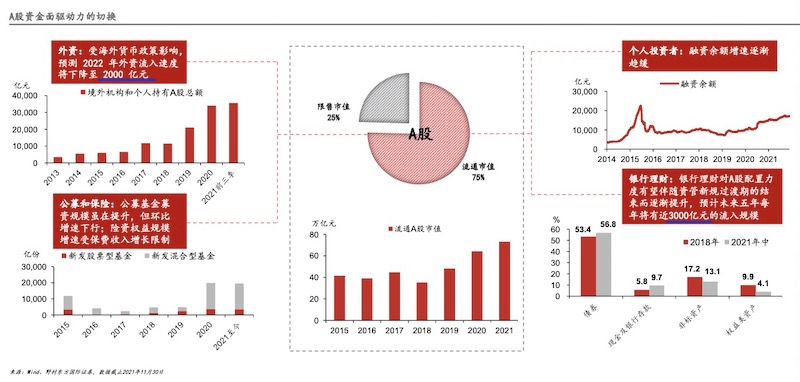 野村东方国际研究部主管高挺对第一财经记者表示,受海外货币政策影响,预测2022年外资流入将降至2000亿元;公募基金募资规模虽在提升,但环比增速将下行;银行理财对A股配置力度有望伴随资管新规过渡期的结束而逐渐提升,预计未来5年每年将有近3000亿元的流入规模。