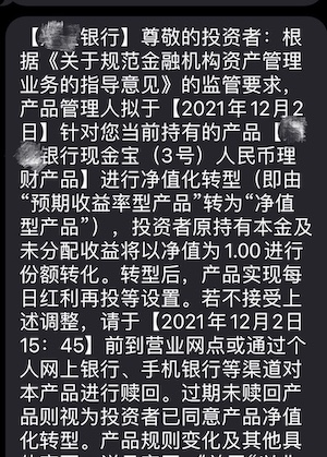 据记者了解,今年底前,各大理财子都在加码备战“真净值”转型。12月初,记者接到一条来自某股份行下属理财子的短信称,根据《关于规范金融机构资产管理业务的指导意见》的监管要求,产品管理人拟于2021年12月2日针对您当前持有的产品【xx银行现金宝(3号)人民币理财产品】进行净值化转型(即由“预期收益率型产品”转为“净值型产品”),投资者原持有本金及未分配收益将以净值为1.00进行份额转化。转型后,产品实现每日红利再投等设置。若不接受上述调整,请于【2021年12月2日15:45】前对本产品进行赎回。