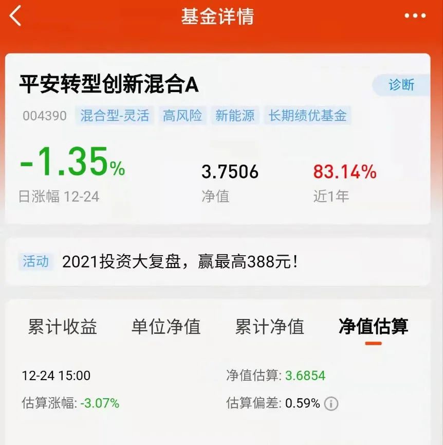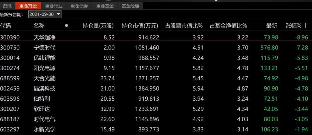 以神爱前管理的平安转型创新混合A为例,12月24日,基金估算净值跌幅为3.07%,基金净值实际下跌了1.35%。从基金三季度末前十大重仓股来看,包括天华超净、宁德时代、亿纬锂能、阳光电源、天合光能等多只新能源板块个股。