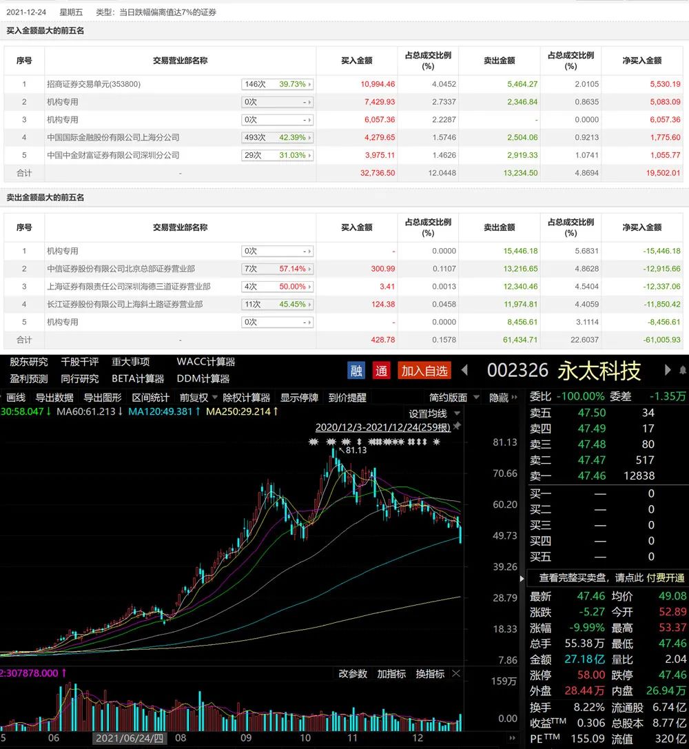 以锂电池板块的大牛股永太科技为例,今年5月以来,其股价涨幅一度超过6倍。12月24日,永太科技跌停。从当日龙虎榜数据来看,机构博弈颇为激烈,不过,卖方力量要大于买方。具体来看,12月24日的永太科技龙虎榜数据显示,2家机构合计净买入1.11亿元,另有2家机构合计净卖出2.39亿元。