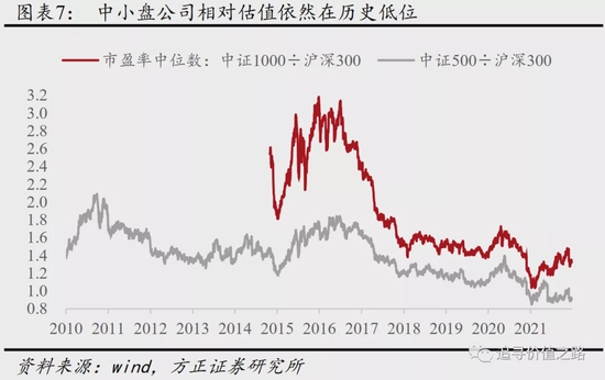 此外,从相对估值来看,目前中证1000指数和中证500指数市盈率中位数相比于沪深300指数市盈率中位数,依然出在历史上较低的位置,换言之,中小盘股票估值溢价率出在历史低位(参见图表7)。目前的这种估值状况也为后续股价表现留出了上行空间。