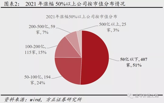 这800家公司按年初(即今年初涨起来前)市值分布来看,有407家公司年初市值在50亿元以下,占比超过一半。而全年涨幅超过50%且年初市值在200亿以下的公司占比能高达90%。