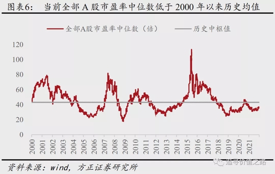 用市盈率中位数度量,可以解决部分低估值板块权重太大的影响。我们统计了2000年以来全部A股的市盈率中位数(参见图表6),即在每天所有A股中计算市盈率的中位数(剔除负数),然后将这个日度数据连续成一个时间序列数据。根据我们的统计,当前全部A股的市盈率中位数大约在36.5倍左右,而同口径下,2000年以来全部A股市盈率中位数的历史平均值是43.2倍。这意味着从市场整体来看,目前A股估值确实不算贵。