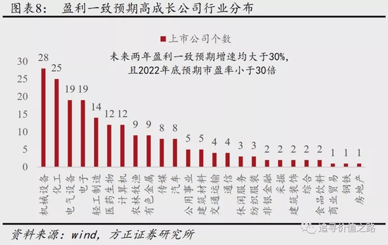 我们根据Wind盈利一致预期汇总统计了目前全部A股的预期成长公司:未来两年公司的盈利一致预期增速均大于30%(即2022年和2023年的盈利预期增速大于30%),且2022年底的预期市盈率小于30倍(即用当前公司的ttm市盈率除以1加上2022年的盈利增速),符合这两个标准的公司数目前一共是201家。从这201家公司的行业分布来看,主要集中在机械设备、化工、电气设备、电子等行业(参见图表8)。