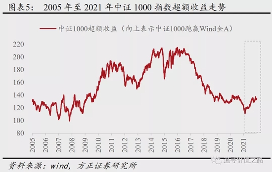 图表5报告了2005年至今中证1000指数超额收益的走势,计算超额收益的基准是Wind全A指数,曲线向上表示中证1000指数跑赢Wind全A指数,可以理解为小盘股风格,曲线向下表明中证1000指数跑输市场整体,可以理解为大盘股风格。