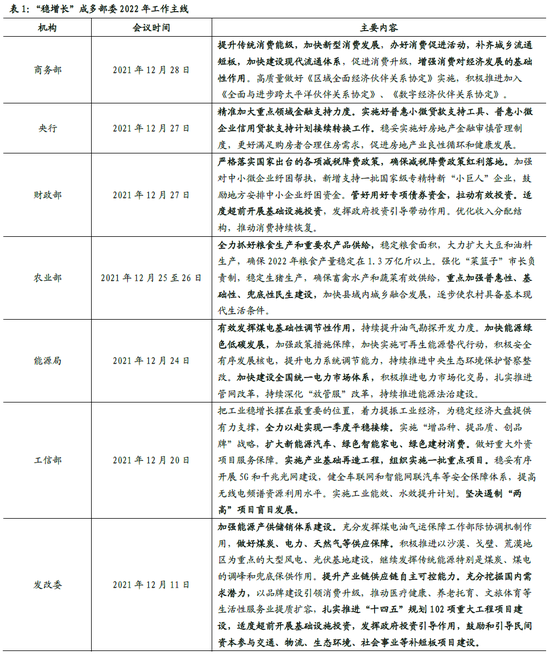 “稳增长”成多部委2022年工作主线,内需为主要抓手,大宗消费和新消费齐头并进,新老基建双管齐下,凸显高质量发展内涵。2021年12月中央经济工作会议召开以来,发改委、财政部、央行等十余个部委相继召开工作会议,部署2022年工作任务。从会议召开的时间来看,发改委、央行等部委年度会议召开时间相较于2021年均有所提前,表明了当前各部门顺应政策适当靠前的布局。从各部委会议的主要内容来看,主要呈现两个特点:第一,各部委2022年工作部署锚定“稳增长”主基调。在2022年经济或将呈现前低后高的背景之下,各部委政策措施呈现“多作为+节奏前置”,如发改委强调“坚持发展是第一要务”、工信部提出“全力以赴实现一季度平稳接续”、财政部指出“积极推出有利于经济稳定的政策”。值得注意的是,央行年度会议中强调“主动推出有利于经济稳定的货币金融政策”,结合四季度货政例会中“发挥好货币政策工具的总量和结构双重功能,更加主动有为”的表述,2022年一季度尤其是两会前后宽松政策或集中落地,再次降准或全面降息可期。第二,内需为稳增长主要抓手,大宗消费和新消费齐头并进,新老基建双管齐下,凸显高质量发展内涵。从各部委的工作部署来看,2022年内需增长将成为稳增长主要抓手。消费方面,在巩固汽车、家电等大宗消费重点的同时,工信部明确将实施“增品种、提品质、创品牌”战略,扩大新能源汽车、绿色智能家电、绿色建材消费。基建方面,目前财政部已提前下达2022年新增专项债务限额1.46万亿元,重点聚焦交通基础设施、能源、农林水利、生态环保等九大方面,预计2022年保障性安居工程、交通水利等老基建项目进度将加快,新能源充电桩、人工智能、工业互联网等新基建规模扩大。