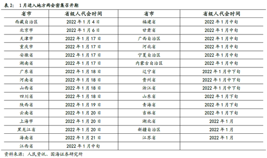 1月进入地方两会密集召开期,重点关注各地对于增长目标的提法以及重点任务、投资项目的布局情况。截至2021年12月末,所有省份均已确定2022年省级地方两会召开时间。时间安排上来看,除过北京、西藏分别于1月4日及1月6日召开地方两会外,其余省份均于1月中下旬召开省级地方两会。从地方两会内容来看,每年年初举行的省级地方两会,不仅是观察各地经济社会发展的窗口,也可为前瞻全国两会提供重要指引。重点关注两个内容:第一,重点关注各省经济增长、固定投资目标等重要指标的设定。从中央经济工作会议及各部委年度会议内容来看,“稳增长”无疑是2022年首要任务,而2022年GDP增速的预期目标将进一步回答“稳在什么样的水平”。回顾2021年地方两会,各省经济增长目标的中位数为6.5%,随后全国两会明确“2021年中国GDP预期增长6%以上”,可见通过地方经济预计增速可前瞻全国GDP增速目标;此外,2022年基建发力已成为确定趋势,相比于2021年地方两会中对固定投资目标设定均趋于谨慎,预计今年固投目标有所提高。第二,关注各省重点任务、投资项目的设定。在稳增长为确定目标的背景下,用什么稳增长及如何稳增长成为市场的主要关注点。2022年各省基础设施建设项目以及是否会在消费领域加大措施力度值得重点关注。