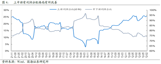 PPI-CPI收敛是主旋律,上中下游利润分配格局改善。11月开始PPI-CPI剪刀差如期开始收敛,且后续剪刀差的持续回落是大势所趋,行业间利润分配格局有望迎来再平衡。从最新公布的工业企业利润数据来看,伴随着PPI见顶回落,11月上下游行业利润分化趋于收敛。其中,11月上游工业企业利润累计占比为24.94%,环比10月首次出现下降,11月利润占比提升行业主要集中于设备制造与消费品制造板块,原材料价格下行带来的成本端压力缓解对于中下游部门的利润改善作用显著。