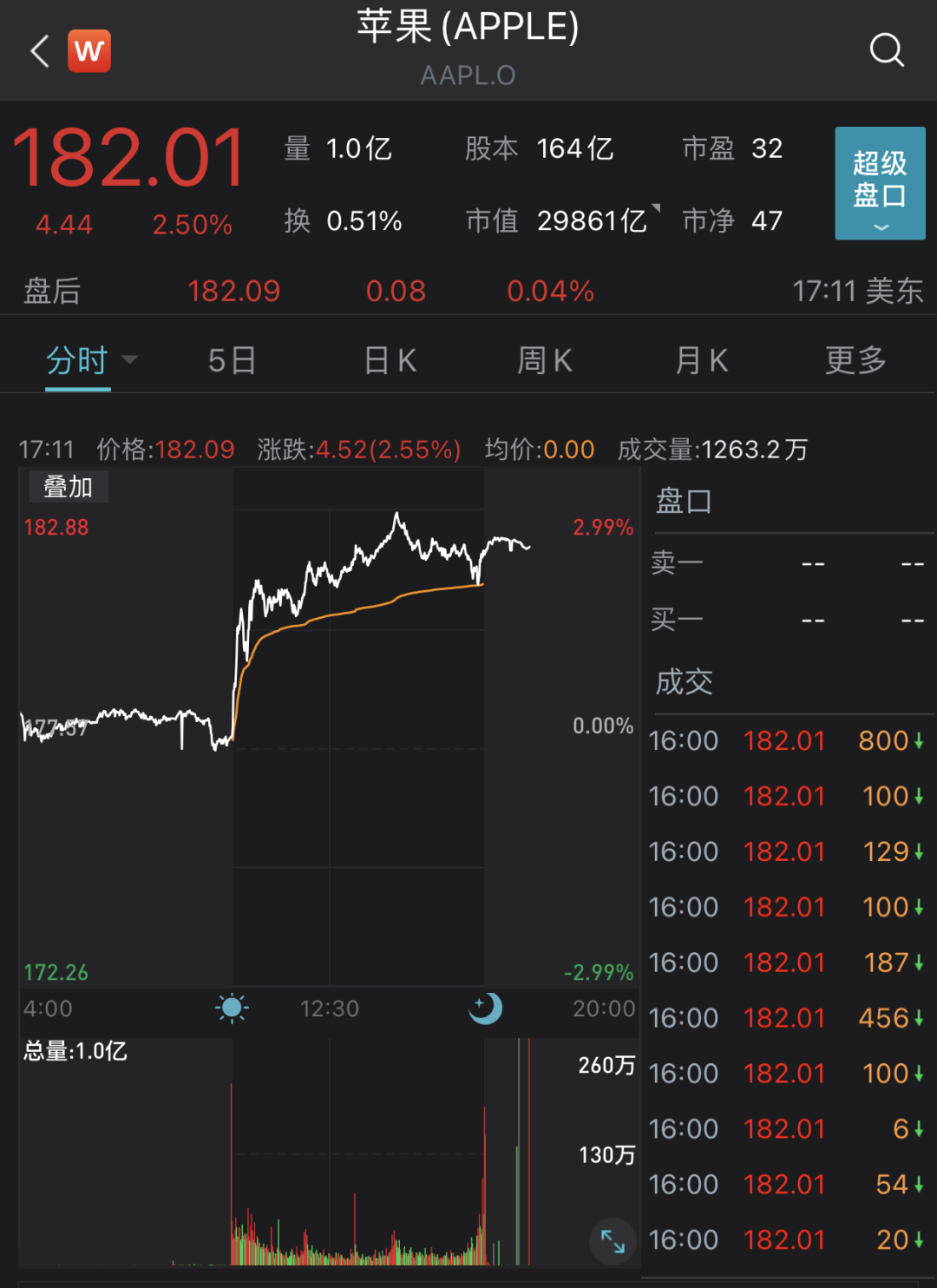 知名科技股表现抢眼。其中,苹果盘中市值首次突破3万亿美元,最终收涨2.50%,报182.01美元,收盘市值达29861亿美元。