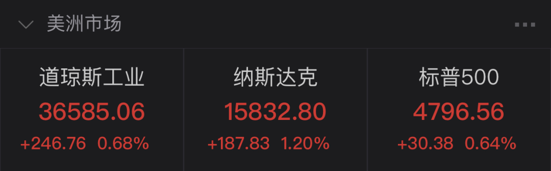 三大股指全线上涨,道指涨0.68%,报36585.06点;标普500指数涨0.64%,报4796.56点;纳指涨1.20%,报15832.80点。道指与标普500指数均创收盘新高。