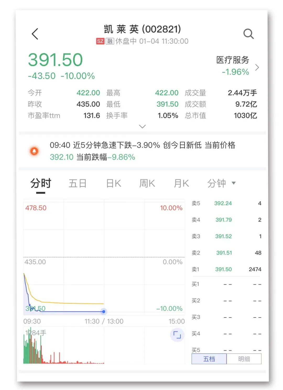 千亿市值医药股凯莱英跌停,截至午间收盘,跌停板上的封单超过2400手,成交额为9.72亿元,市值蒸发超110亿元。