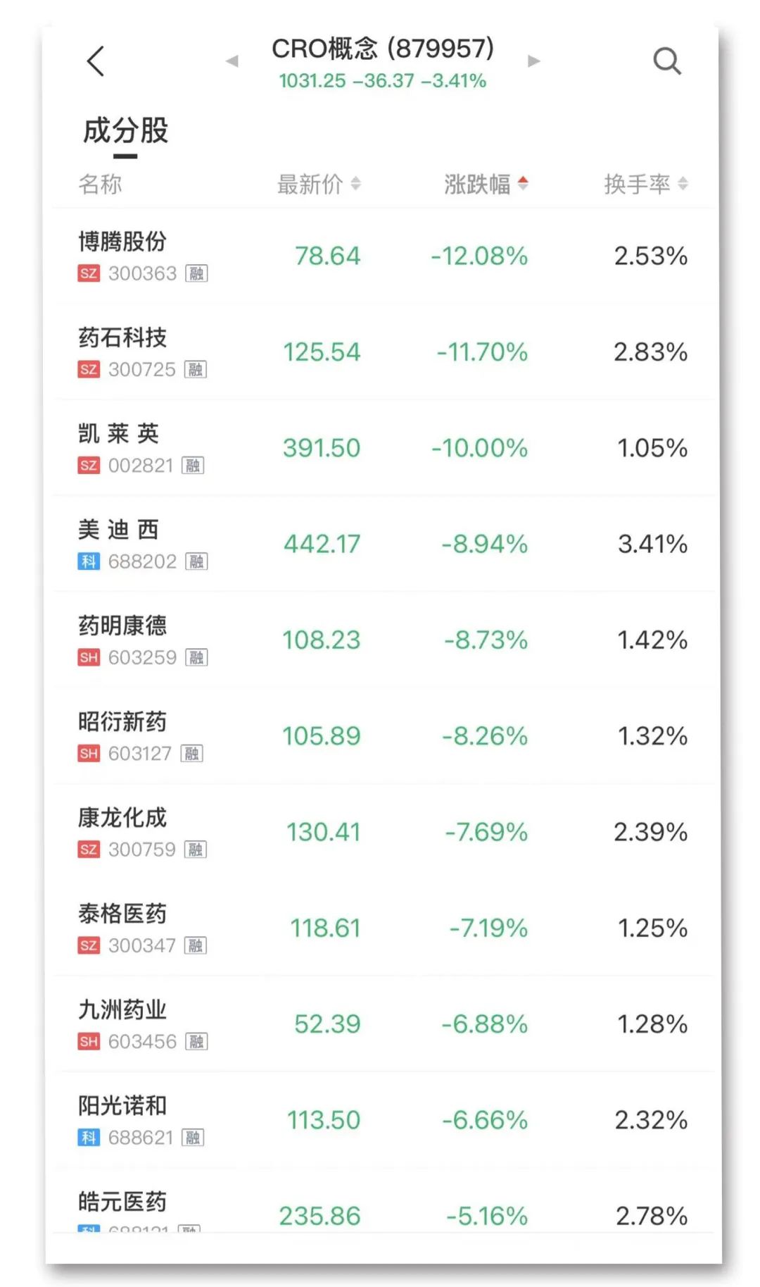 CRO板块大跌,博腾股份(维权)跌逾12%,药石科技跌逾11%,凯莱英闪崩跌停,美迪西、药明康德、昭衍新药跌逾8%,康龙化成、泰格医药跌逾7%。