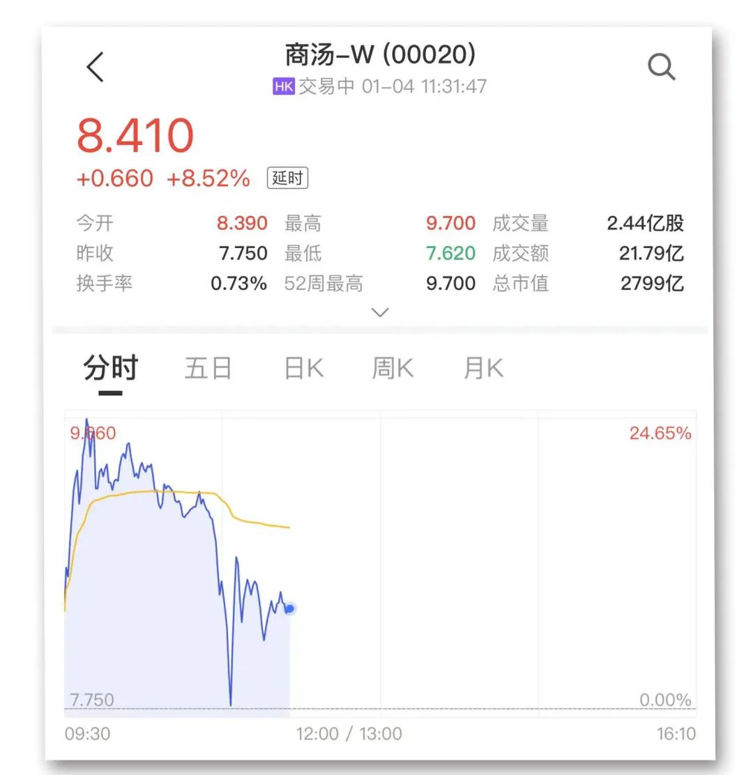 2021年12月30日,商汤-W在港股上市,上市首日上涨7.27%,之后持续大涨,12月31日涨逾30%,1月3日涨逾40%,今日,商汤-W冲高回落,盘中总市值一度突破3000亿港元。