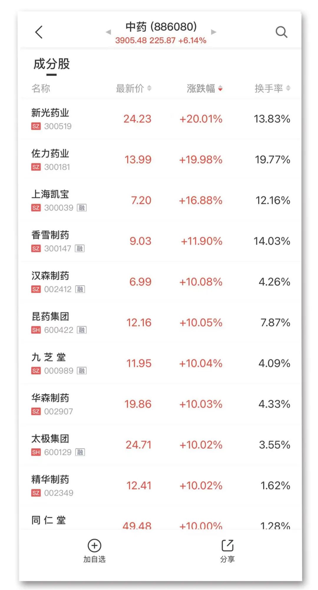 中药板块上演涨停潮,板块内新光药业、佐力药业上演“20CM”涨停,汉森制药、昆药集团、千金药业、九芝堂、华森制药、同仁堂等十多只股票涨停,其中同仁堂、健民集团创历史新高。