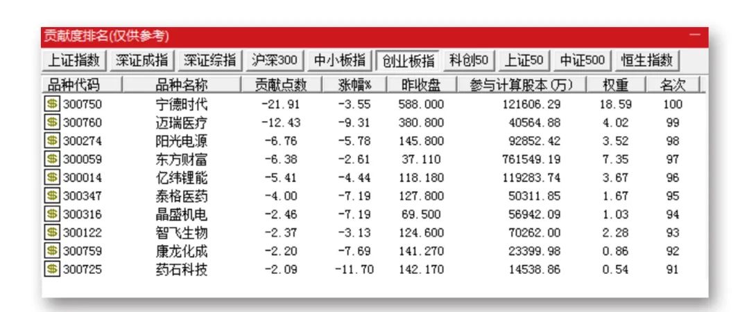 从跌逾2%的创业板指来看,宁德时代、迈瑞医疗、阳光电源、东方财富、亿纬锂能等创业板权重股对创业板指负贡献度居前,对创业板指的下跌起了主要作用,其中宁德时代跌逾3%,迈瑞医疗跌逾9%。上证指数负贡献度居前的股票分别为药明康德(维权)、招商银行、天合光能、隆基股份、贵州茅台等。