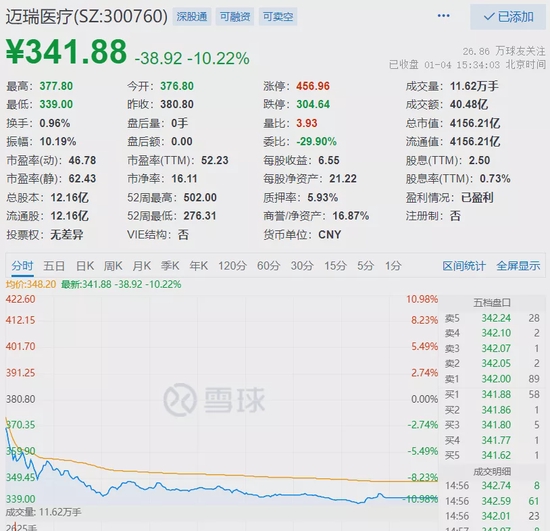 1月4日,迈瑞医疗股价大幅下跌,截至收盘报341.88元,跌幅10.22%。
