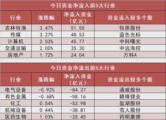28个申万一级行业中,15个行业实现资金净流入,其中农林牧渔行业净流入51.5亿元居首。