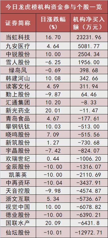 盘后龙虎榜数据显示,机构现身25股,其中当虹科技等8股呈现机构资金净买入,仙坛股份等17股呈现机构资金净卖出。