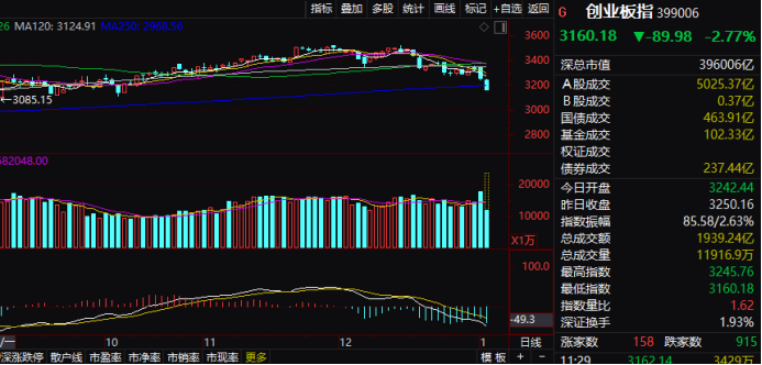 创业板指数盘中跌2.77%,跌穿年线。