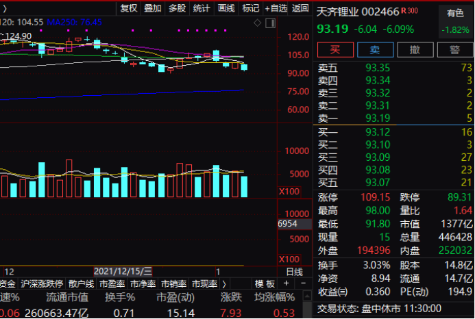 千亿市值的新能源龙头天齐锂业盘中暴跌超过7%。