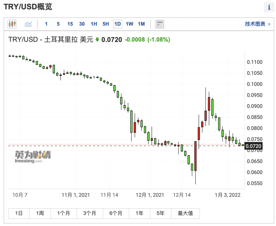 近期,土耳其里拉兑美元再度上演大跌行情,去年12月27日一度大跌超8%,随后一路走低,近10个交易日累计跌幅接近24%,而去年全年的贬值幅度超43%,成为了全球最惨烈的新兴市场货币之一。