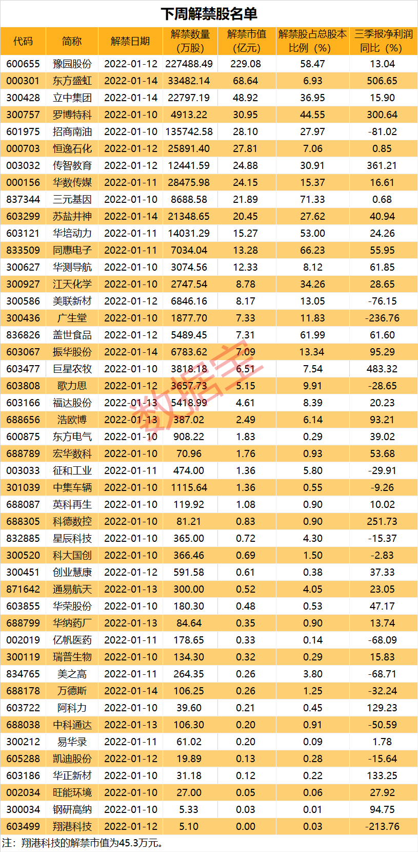 解禁市值规模最大的是豫园股份,下周将有22.75亿股上市流通,主要是定向增发机构配售股份,解禁市值达229.08亿元。东方盛虹、立中集团、罗博特科、招商南油的解禁市值居前。