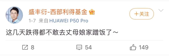 西部利得基金经理盛丰衍的发声显得与众不同——“这几天跌得都不敢去丈母娘家蹭饭了。”