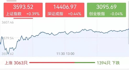 周一,A股三大指数涨跌不一,截至收盘,上证指数报3593.52点,涨0.39%,结束连续四日下跌;深证成指涨0.44%,报14406.97点;创业板指微跌0.04%,报3095.69点;沪深两市合计成交额10514亿元,两市成交额连续第7个交易日破万亿元;北向资金净买入47.58亿元;总体来看,两市个股涨多跌少,超3000只个股上涨。