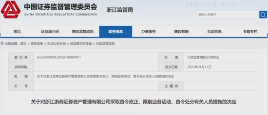 1月11日,浙商资管处罚落地。浙江证监局网站公布对浙商证券子公司浙商资管采取责令改正、限制业务活动、责令处分有关人员措施的决定,浙商资管私募资管产品被暂停备案6个月。