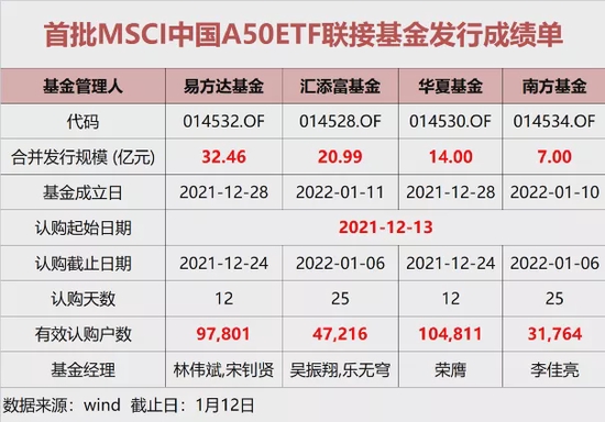 数据显示,截至1月12日,首批四只MSCI中国A50 ETF联接基金已经悉数成立,28万户总计认购规模为74.45亿元。其中,易方达基金发行规模最大,达到32亿元,汇添富、华夏、南方基金也分别有21亿元、14亿元、7亿元销量。