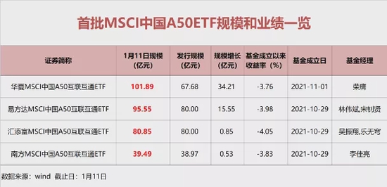 Wind数据显示,截至1月11日收盘,目前首批MSCI中国A50 ETF产品总规模达到318亿元,两个多月规模激增51亿元,规模增幅接近20%。