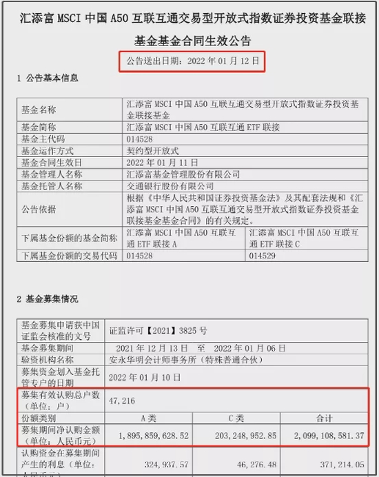 1月12日,汇添富基金发布公告称,汇添富MSCI中国A50互联互通ETF联接基金合同正式生效。公告信息显示,该只基金从2021年12月13日至2022年1月6日认购,认购天数25天,合计有4.72万户投资者认购,募资总规模为21亿元。