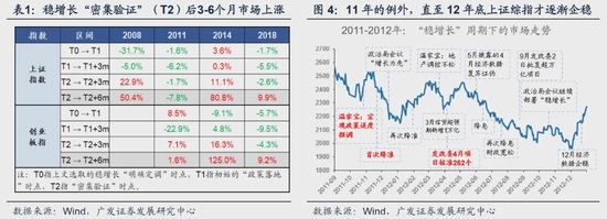 从市场表现来看,历次稳增长从T0 “明确定调”到T1 “政策落地”,市场短暂上涨后继续震荡下跌,显示“衰退担忧”依然占据主导;而市场在T2“密集验证”期之后的3-6个月区间涨幅转为正,视“稳增长”力度及效果。下表1可见,从T0“定调转向”到T1“政策落地”之间市场大多区间下跌,例如11年10月温总理讲话明确转向后市场仅有半个月的反弹随后继续下行,18年7月从“去杠杆”转为“稳增长”后仅反弹3个交易日;T1“政策落地”后的区间3个月内市场表现亦不佳,而至T2“密集验证”后的3-6个月市场才逐渐企稳,观察政策密集发力的效果,如11-12年叠加海外欧债危机,虽然密集的政策落地但稳增长对经济复苏的效果不佳、市场直到12年底才逐渐企稳。