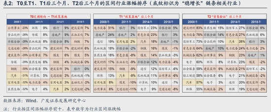 从行业表现来看,稳增长自T0“定调转向”后即是增配时机,T0至T1区间稳增长链条行业超额收益显著,而在T1、T2政策线条更清晰后行业表现更为聚拢。下表2可见,除了11年之外,08、14、18年在T0“定调转向”至T1“政策落地”稳增长相关行业(地产基建链、大金融、汽车家电促消费)就已经涨幅居前并实现显著超额收益,由于此时处于政策的想象期,相关行业均有不错表现;而到了初始政策落地T1后三个月、密集政策验证T2后三个月,行业表现因政策发力线条的不同来展开——08年“四万亿”下基建链条最强劲,11年底降准、18年7月去杠杆转稳杠杆后大金融表现最优,12年地方地产政策松动拉动地产,14年聚焦棚改及铁路水利等重点工程建设带动周期股。