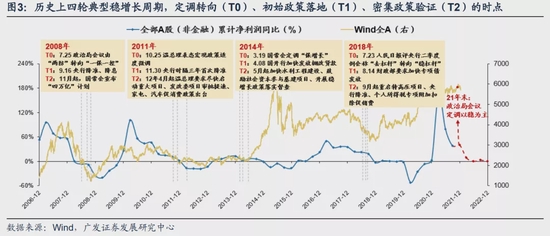 (二)近期市场交流普遍关注的点在于:21年底“稳增长”定调鲜明,为何市场表现不佳?从历史上典型盈利下行期的“稳增长”来看(08年、11年、14年、18年),市场每一轮“稳增长”周期会有三个重要时点:明确的定调转向(T0)、初始政策落地(T1)、密集政策验证(T2)。