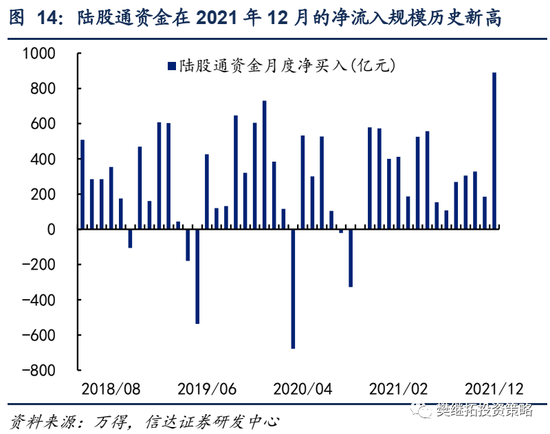北上资金月度净流入创历史新高。2021年北上资金全年净流入金额已达到2020年的两倍之多。其中,2021年12月,北上资金净流入889.92亿元,是陆股通开通以来净流入最多的一个月份。