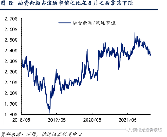 融资余额在12月小幅下降,与股市的震荡上涨构成了背离,最终体现为融资余额占自由流通市值比例持续下降。当前融资余额占流通市值的比例已经下降到了2021年5月-6月时的水平。