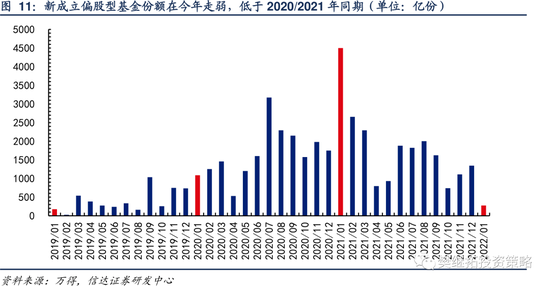 近期公募基金份额增幅不稳定。2021年全年偏股型公募基金份额较2020年增加10583.72亿份,仍处于历史较高水平。从月度数据来看,2021年12月份额增加1053.84亿份,好于2021年二季度之后的多数月份,这也带动12月的资金净流入相较11月边际回暖。但进入2022年之后,偏股型公募基金新发行份额大幅下降,由此前的千亿水平降至不足300亿。