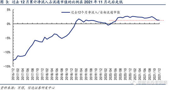 过去12个月累计净流入占自由流通市值的比例在2021年11月之后明显走弱。从分项来看,资金流入项较为平稳,2021年12月一度在公募基金份额新增的带动下回暖,但资金流出项中股权融资和产业资本净减持明显增加。从趋势上来看,过去12月累计净流入额占自由流通市值的比例仍高于2019年下半年和2020年上半年。