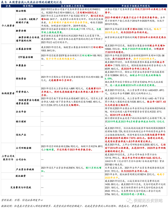 2021年11月之后资金净流入边际放缓,外资流入也没能改变这一情况。2021年最后两个月份的资金净流入情况明显差于此前月份,也弱于2020年同期。1)外资在2021年末大幅净流入,单月净流入创历史新高。2)2021Q2以来,公募基金份额增量不够稳定。其中2021年7月、8月、11月、12月偏强,其他月份则偏弱。3)上述资金流入项目没能改变净流入放缓的大趋势,主要源于股权融资规模在2021年11月、12月大幅增加。