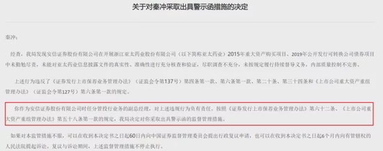 值得注意的是,此次8张“罚单”中,浙江证监局对时任安信证券分管投行业务的副总经理秦冲出具警示函。