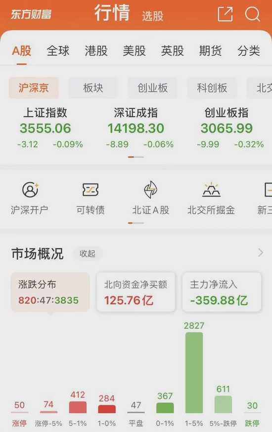 1月20日,A股三大指数走弱,集体收跌。截至收盘,上证指数跌0.09%报3555.06点,深证成指跌0.06%报14198.30点,创业板指跌0.32%报3065.99点;两市合计成交11290亿元。个股方面,在可交易的A股中,上涨个股有820只,下跌个股有3835只,平盘个股34只;两市涨停股50只,跌停股31只。