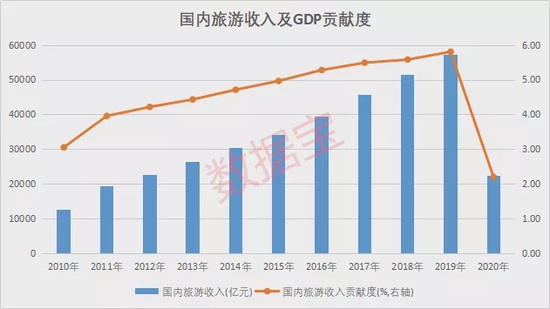 旅游业对GDP贡献不可缺少的一部分。根据国家统计局数据,2019年国内旅游业收入超过55万亿元,创历史新高。“十三五”期间,出入境旅游发展健康有序,年出入境旅游总人数突破3亿人次。旅游业也是受新冠疫情影响最严重的产业之一,2020年旅游业收入下降至2.23万亿元,较2019年旅游收入断崖式下跌,回到8年前(2012年)水平。