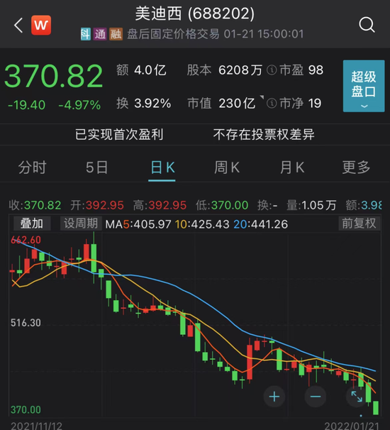 CRO赛道股美迪西,从2020年12月到2021年9月,股价累计上涨近13倍,但最近走势有点惨,昨日下跌6.24%,收盘价为390.22元/股,与去年的历史最高点800.01元/股相比,股价已经腰斩。