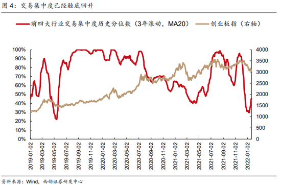 另外一方面从衡量市场热度的热门行业交易拥挤度数据显示市场热情正在逐步恢复。从历史上看,热门行业的交易集中度往往反映了市场对于一致性预期的追逐热度,当这一指标位于低位时,往往是市场(尤其是成长板块)处于极度低迷状态,类似情况出现在2019年5月,2021年4月,以及2022年1月,从长时间维度来看,前两次都是创业板指数的阶段性低位。当前来看,这一指标读数在1月10日达到29.6%分数数水平后,已经开始逐步回升,这也意味着成长板块的情绪修复已经在进行之中。