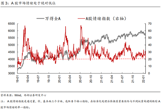 当前市场情绪已经降至绝对低位。从我们跟踪的A股市场情绪指数来看,当前市场情绪已经处于2020年以来的低位水平,而从过去几年的历史来看,市场情绪到达这一水平后,往往意味着市场阶段性底部的出现。截至本周五,市场情绪指数读数为21.6,处于历史20%分位数以下。2020年以来,仅有2020年3-4月,9月底,12月中旬,以及2021年4月和10月,市场情绪指标达到这一低位,而这些时间都是当时市场的阶段性低点。